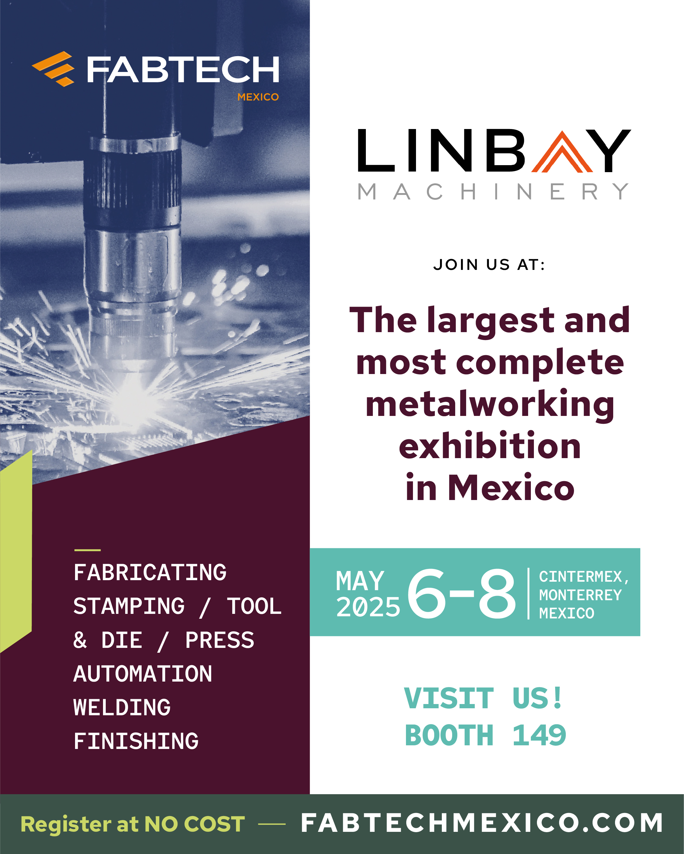 We are pleased to announce that Linbay Machinery will participate in FABTECH Mexico 2025, one of the most important events in the metalworking and manufacturing industry in Latin America. This prestigious trade show will take place from May 6 to 8, 2025 at CINTERMEX, Monterrey (Av. Fundidora No. 501 – Col. Obrera, Monterrey, Nuevo León 64010).
