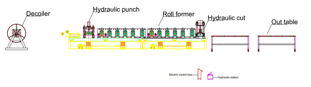 This rolling shutter door rail roll forming machine for the production of 3mm wind resistant rolling shutter door guide rails consists of a decoiler, guide, hydraulic punch, main roll forming machine, transmission system (chain-brackets or gearbox), shearing, hydraulic oil pump, PLC control cabinet and out tables.