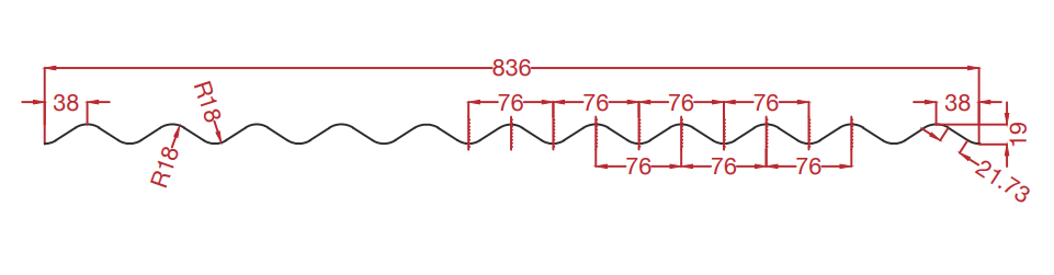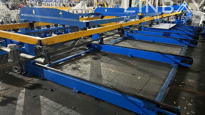 Our 836 Sinusoidsal panel roll forming machine is first equipped with a hydraulic uncoiler. The hydraulic running motor power is 5.5kw and the hydraulic motor power is 3kw. Its feeding width is 1000mm. The material of the coil could be galvanized and the normal thickness is 0.4-0.6mm. The yield strength of the coil is 300Mpa. This entire production line Weighs 15 tons. Going through the guiding part, is the main body of the roll forming machine. We choose a gearbox-driven cast iron structure which is more stable. There are 18 stands in the forming station and we provide a 11kw motor. The speed of the forming machine is 40m/min. In the shearing part the machine uses an electric cut. This cutting method is high efficiency which will increase the cutting speed. Finally, there is an out table.