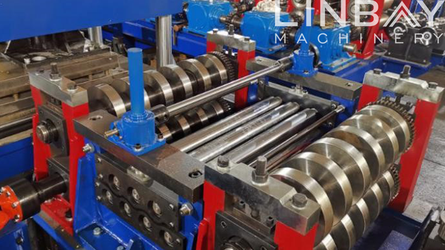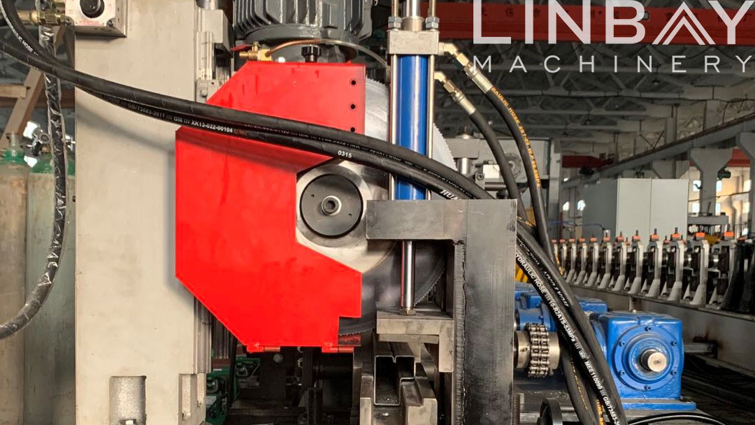 This step beam roll forming machine has 5 sections. At the beginning, it is equipped with a 3 ton manual uncoiler. The manual uncoiler is economical and save space. Its feeding width is 300mm. The raw material of the coil should be A-36(Q235) and its normal thickness is around 2mm. Since the material is thicker, the yield strength is 235Mpa. This whole production line weighs almost 30 tons. The section of the roll former we use a 110 cast iron structure which is more stable. There are 32 stands in the forming station and we provide a 30kw motor. The speed of the production line is around 6m/min. The driving system is gear-box drive which will be more fast. The machine uses a saw cutting method. In the end of this production line, there is an out table.