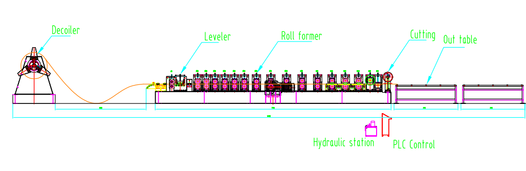Hydraulic decoiler-Guiding-Leveler-Roll former-Hydraulic saw cut-Out tables