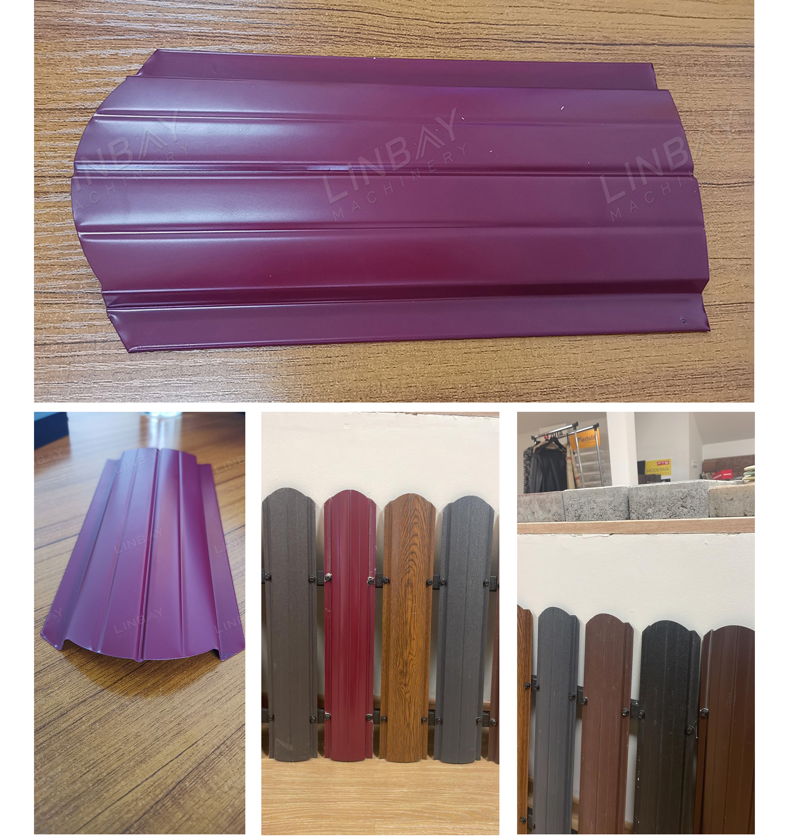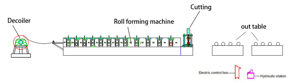 The complete forming process for metal fence posts: uncoiler - forming machine - shearing -out tables. Very simple and clear, the focus is on the final mould shearing part where we add a mould so that the shear comes out rounded.