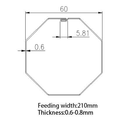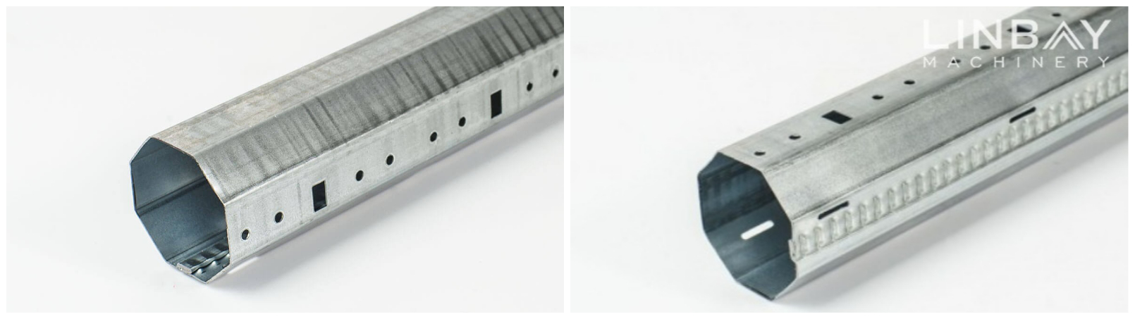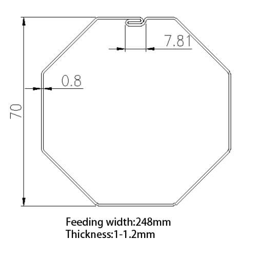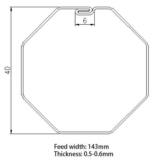The octagonal tube is a very important accessory in the rolling shutter system. During the forming process, the steel coils will be connected and overlapped on one side by roll forming machine, so that the profile becomes a closed regular octagonal shape.