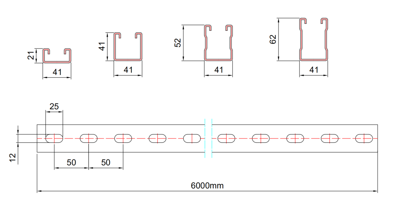 Strut channel roll forming machine is also called like seismic support roll forming machine or seismic channel roll forming machine, its product is used to mount, brace, support, and connect lightweight structural loads in building construction. Our strut channel roll forming machine is suitable to produce strut channels with 12 gauge(2.6mm) or 14 gauge(1.9mm) thick sheet metal (normally range 2-2.5mm), raw material could be Hot-rolled and cold rolled steel, Hot-dip galvanized sheet, Pre-Galvanized Steel, Mill(Plain/Black) Steel, Aluminum, Stainless Steel etc. And according to slot type, our machine could produce solid channel, slotted channel, half slotted channel, long slotted channel, punched channel, punched and slotted channel etc.