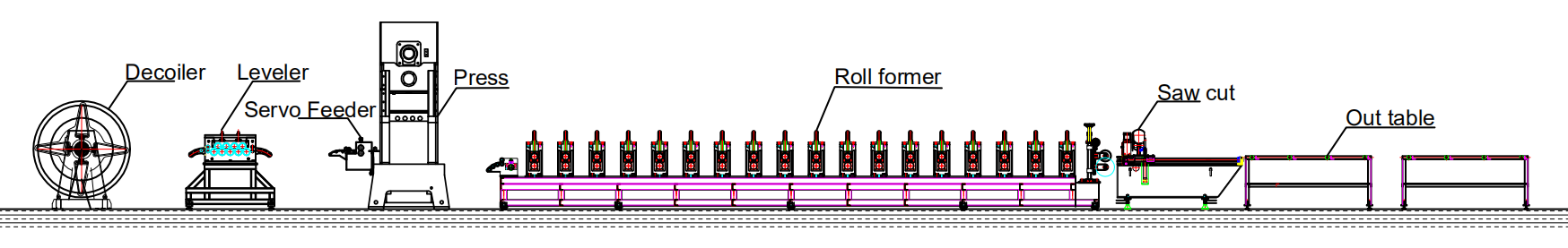 Hydraulic decoiler-Levler-servo feeder-Press- Roll former-Flying saw cut-Out table