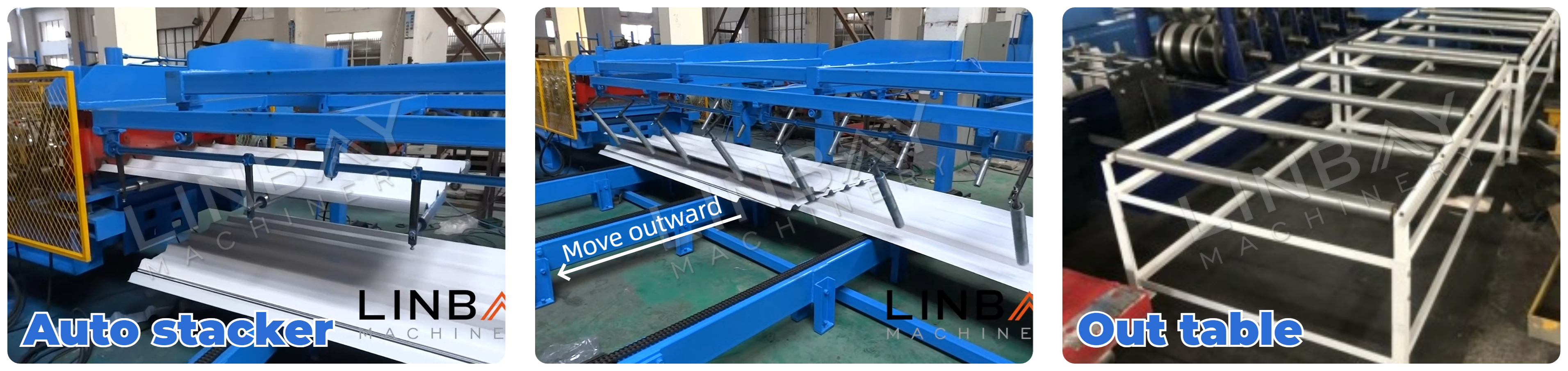 However, when the length of the trapezoidal panel exceeds 6m, considering the width and weight of the panel, we recommend using an auto stacker to reduce manual labor costs and enhance overall efficiency and work safety. After cutting, the trapezoidal panels are conveyed to the stacker's swing arm, gently layering the panels. And then, the panels are transported outward along the conveyor.