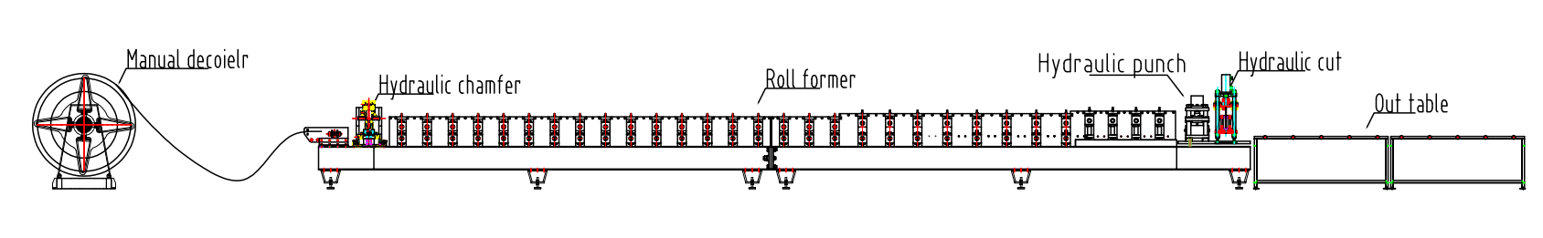 This wire mesh fence post roll forming machine has a basic configuration: manual decoiler-hydraulic chamfer-roll former-hydraulic punch-hydraulic post cut-out table. At the feeding part of the roll forming machine, we make a chamfer device, this is easy for post cutting. The punch system equipped on the roll former, it can reduce the machine’s cost it’s an economic choice, but the working speed will be low, around 4m/min. Customer can choose Case B’s machine configuration if you want a fast speed roll forming machine.
