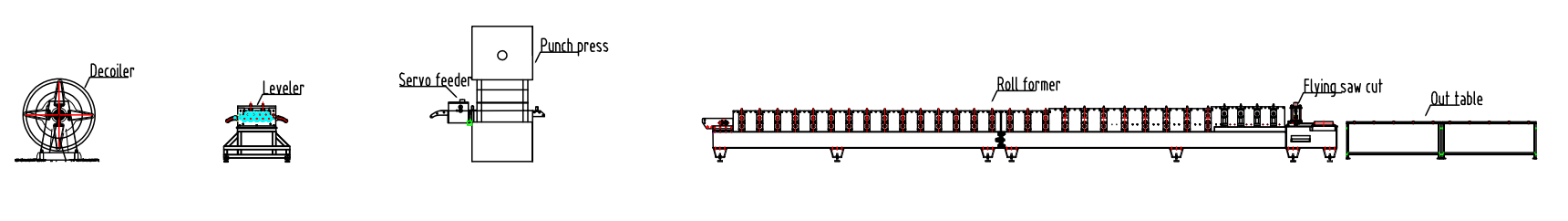 Hydraulic decoiler-Leveler-Servo feeder-Punch press-Pit-Roll former-Flying saw cut-Out table